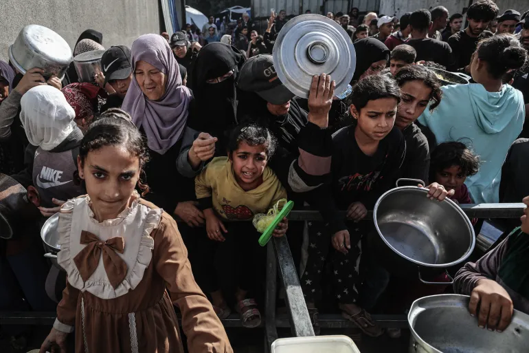 Gazans wait to receive meals, as Israel cuts off all humanitarian organizations from Gaza. [Al Jazeera]